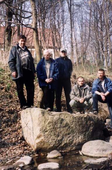 Członkowie Towarzystwa przed prób± wyci±gnięcia kamienia.Od lewej :ks. dr Kazimierz Żuchowski, dr Jerzy Prochwicz, Dorian Burdyło, Piotr Kapu¶ciński, Krzysztof Wołoszczak